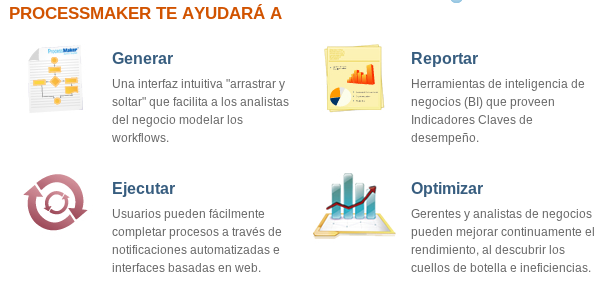 La caja de herramientas ProcessMaker permite a los usuarios de negocio crear formas y mapas de flujos de trabajo completamente funcionales. El software está completamente basado en web, lo que facilita la coordinación del flujo de trabajo entre los usuarios, departamentos y organizaciones. Como una aplicación de SOA de gran alcance, ProcessMaker puede interconectarse con sistemas que incluyen la gestión de documentos, ERP, CRM, DMS y aplicaciones de inteligencia empresarial.
